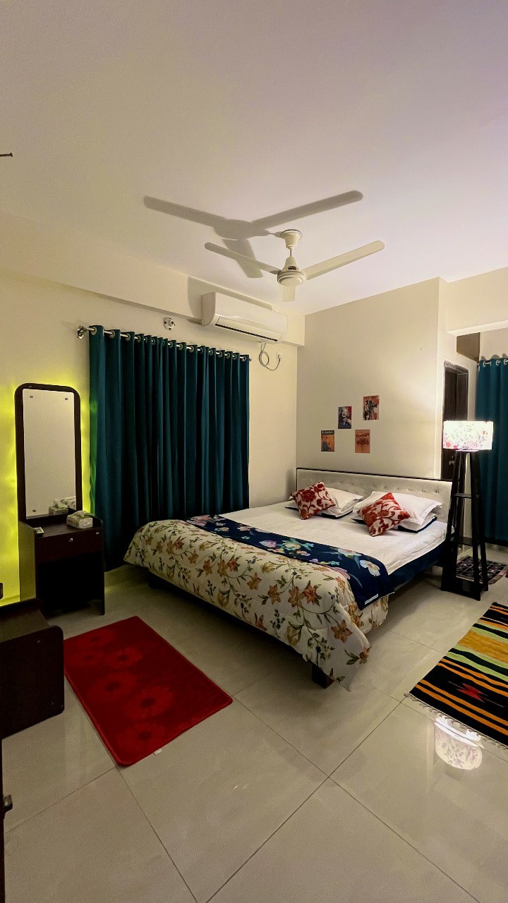 Lujoso apartamento de 3 dormitorios con camas ortopédicas europeas, sábanas frescas, toallas, aire acondicionado, escritorios, balcones privados y baños privados con duchas de agua caliente. Disfruta de un elegante salón con TV y una moderna cocina totalmente equipada con microondas, tostadora, nevera y lavadora. Ofrece wifi de alta velocidad, energía de reserva y acceso a la azotea compartida, la sala de oración, la parrilla para barbacoa y la sala de juegos. Ubicado en North Banani, seguro, sereno y verde. Ideal para expatriados, familias, viajeros de negocios y estancias largas.