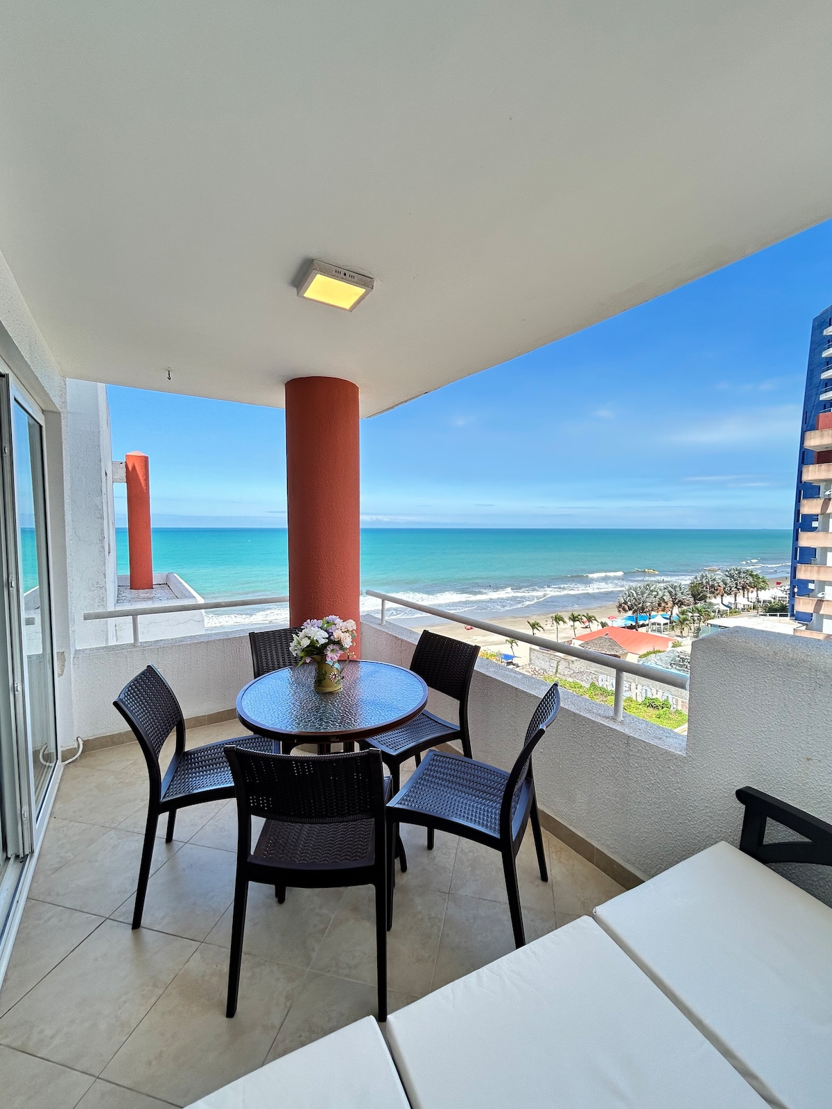 Departamento de lujo frente al mar, perfecto para parejas, familias o grupos que buscan relajarse en un entorno exclusivo junto al mar. Está completamente amueblado, equipado con electrodomésticos de alta gama. Cuenta con un amplio balcón con tina de hidromasaje y vista directa a la playa. Tiene dos habitaciones: una con cama King size y otra con dos literas y una cama adicional. Incluye acceso a tres elevadores y un espacio en el estacionamiento privado.