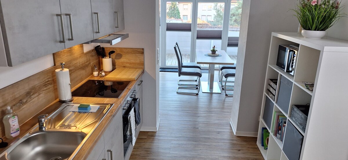 Apartamento excepcionalmente bonito (aprox. 47 m²) en una villa reformada con cariño de acuerdo con su condición de edificio protegido. El apartamento está situado en el primer piso y consta de 1 salón y dormitorio, 1 cocina totalmente equipada y 1 cuarto de ducha recién modernizado. Se puede acceder al apartamento por separado a través de una escalera compartida. Nota: El salón/dormitorio y la cocina/baño están separados por una escalera. La ubicación es muy céntrica: el centro de la ciudad y la estación de tren están a 5 minutos a pie.