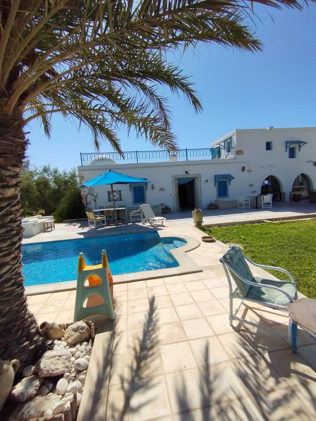 Este elegante alojamiento con arquitectura típica, tranquilo y entre palmeras y olivos, es perfecto para una familia o dos o incluso un grupo de amigos. Una casa sin pasar por alto, vallada, con un gran jardín, entrada independiente,dos terrazas muy amplias (en planta baja y arriba), vista panorámica (palmeras, olivos, mar). Es joyería