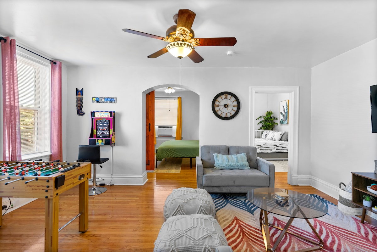 Disfruta de este espacioso apartamento en el segundo piso en el corazón del histórico Dogtown, St. El vibrante barrio irlandés de Louis. Camina hasta el zoológico, Forest Park y disfruta de restaurantes, bares, cafeterías y boutiques cercanos. Relájate en el patio cerrado con encantadoras vistas al barrio o diviértete con la mesa de futbolín y la máquina de Pac-Man. El exclusivo loft tamaño king del tercer piso añade un toque especial a esta joya ubicada en el centro. Perfecto para una escapada inolvidable a St. ¡Reserva tu estancia hoy mismo!