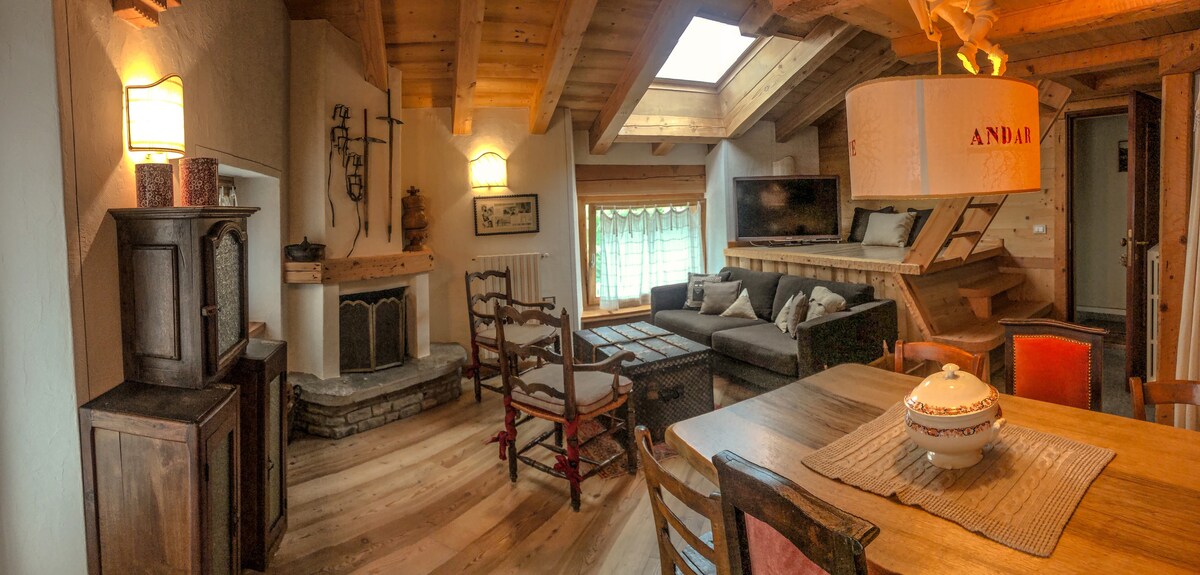Porción independiente en un pequeño chalet a 1,5 km desde el centro de Courmayeur. Acceso a pie desde un camino de 200 metros de largo, maravillosa ubicación en el borde del bosque con vistas al Mont Blanc, sin casas cerca. Pequeño pero acogedor estilo de cabaña artesanal, aprovechando al máximo los espacios. Calefacción independiente. 1 cama matrimonial + 1 sofá cama por tercer huésped. (+ 20 € por sábanas adicionales si dos huéspedes duermen en camas separadas). Plaza de estacionamiento privada.