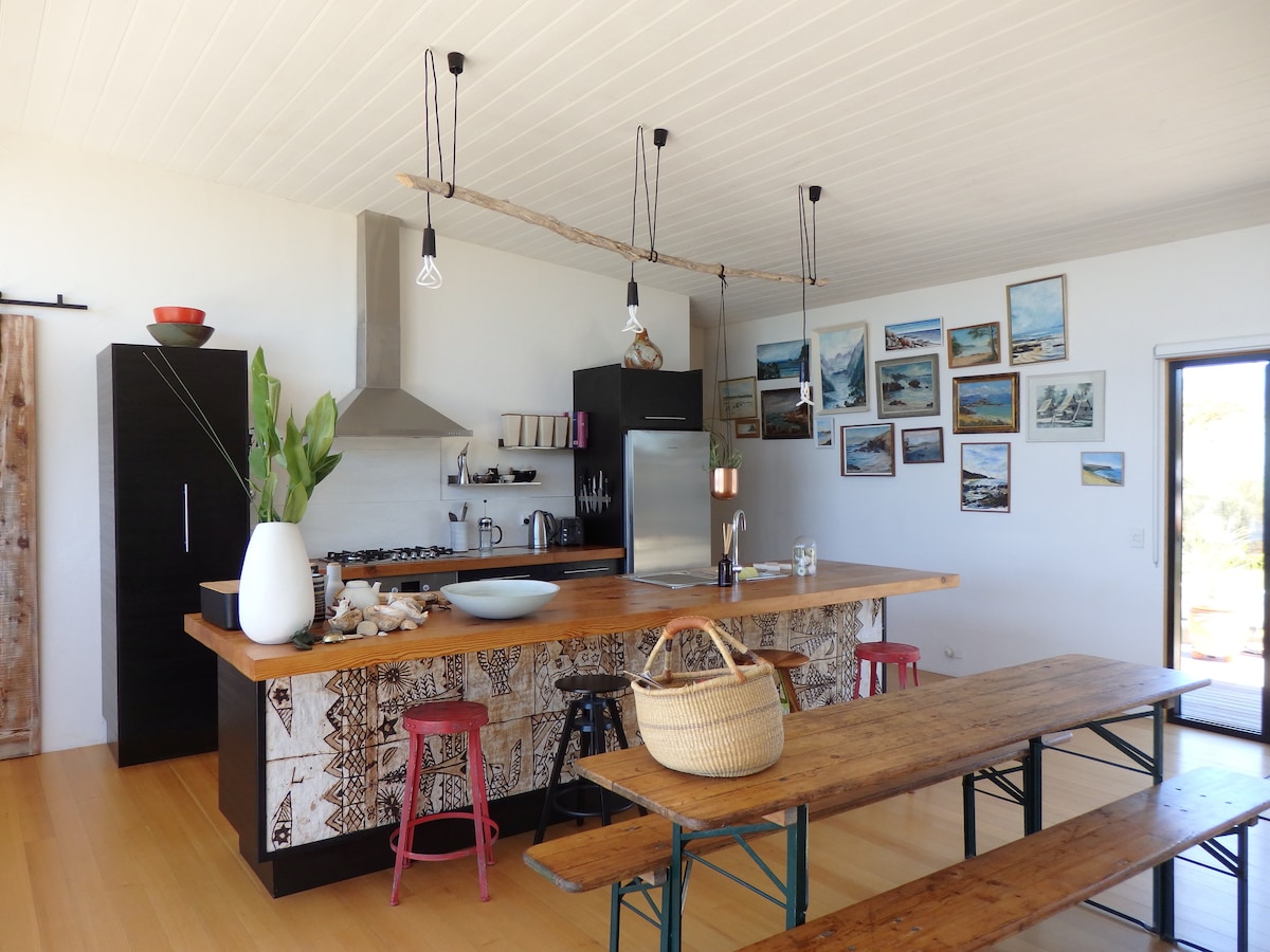 Once known as Millingtons House, Sunways is a light-filled 1925 home just steps from the river and a short stroll to the ocean beach. With two spacious queen bedrooms, a fresh bathroom featuring Salus botanicals, and a sunroom made for lazy afternoons, it’s a place to slow down. On arrival, enjoy Bellebonne sparkling rosé and Kenyak chocolates before unwinding into the rhythm of sea air and old-world charm. Pet-friendly stay - max 2 dogs welcome.