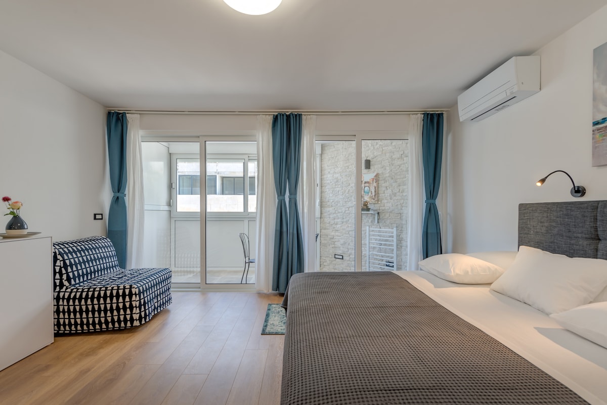 Despiértate bajo las vigas a la vista de los techos de madera centenarios. Déjate seducir por los toques antiguos, las escaleras de estilo industrial y los finos acabados ubicados detrás de los enormes arcos internos de piedra del Palacio Imperial. Después de explorar las delicias de Split, donde las piezas del museo adornan una paleta de arena y tonos tierra apagados, bebe una copa de vino en el balcón de este loft único, empapado de historia.
