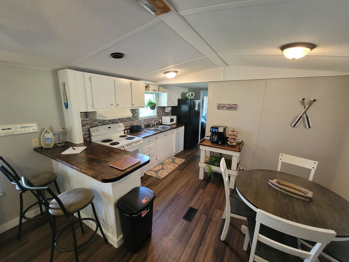 Disfruta del encantador entorno de esta romántica casa frente al lago. Un dormitorio , baño completo, cocina completa y sala de estar. El sofá hace una cama. Amplio porche con parrilla, seccional, TV al aire libre y hermosa vista al lago con chimenea al aire libre. Esta casa en el parque se encuentra dentro de Douglas Lake Campground. Tendrás uso de la piscina, la cancha de baloncesto y el parque infantil. Pasa y visita la tienda para comer cebo y aperitivos. Camiones de comida el sábado.