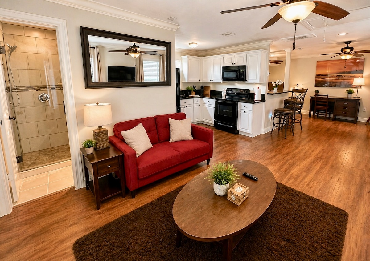 ¡Ven a alojarte en nuestro nuevo apartamento tipo garaje con temática de playa! Tenemos una cómoda cama tamaño queen, un televisor nuevo, una cocina completa y una entrada privada. Podemos proporcionar un colchón de aire y ropa de cama adicional si se solicita con antelación. Es ideal para estancias cortas o largas. Mascotas no permitidas. Grandes descuentos para estancias largas: no dudes en enviarme un mensaje para obtener más información.