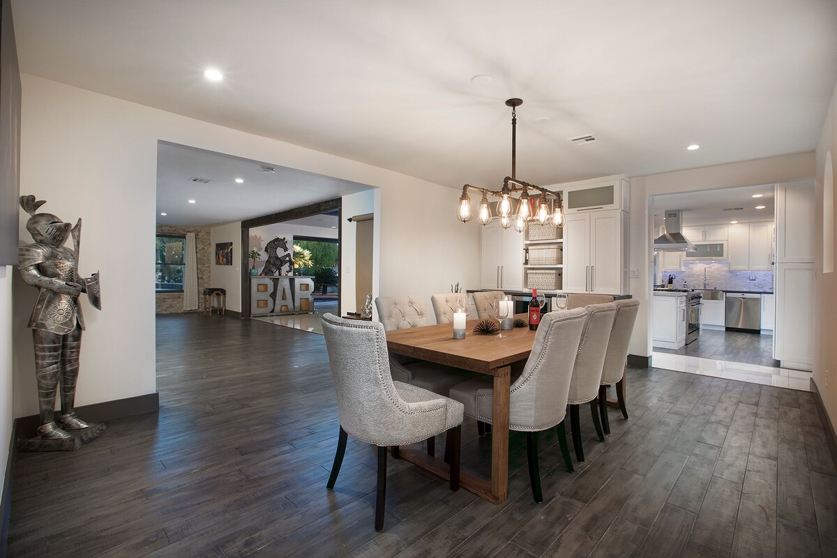 ¡Este es un impresionante oasis del desierto estilo Palm Springs para disfrutar de tu experiencia en Las Vegas! Cuenta con un espacioso patio trasero equipado con una increíble piscina, una isla con parrilla y múltiples zonas de descanso. ¡Disfruta de un descanso del calor del desierto con un chapuzón en la piscina de tu oasis privado! Hay una zona de oficina con internet para trabajar a distancia. Se proporcionan todos los elementos esenciales que puedas necesitar para cocinar, una cafetera Keurig y una zona de lavandería totalmente equipada. Relájate y desconecta en este alojamiento tranquilo y elegante. Lic. G71-06392