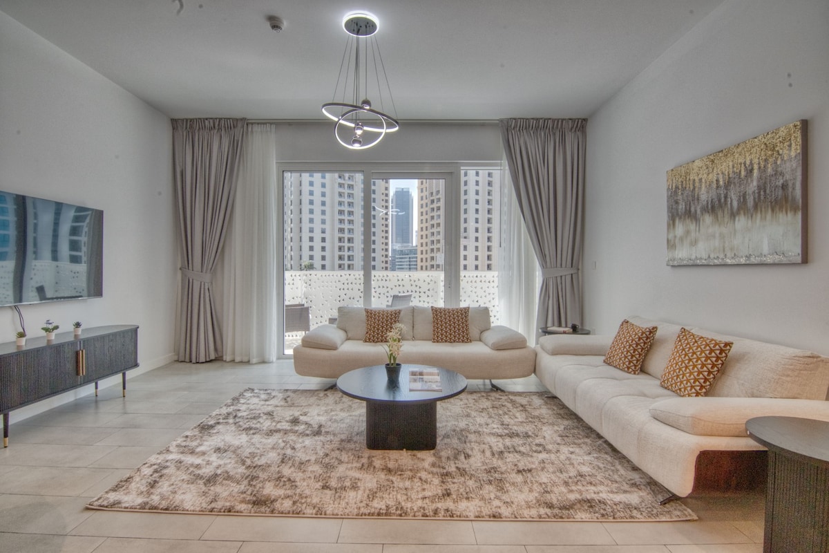 💫 Lujoso 1BR renovado en JBR con vistas al horizonte de Marina. 📍Ubicación privilegiada en Dubai Marina: a 1 minuto de JBR Beach, The Walk, The Beach y a pocos minutos de Marina Mall, Marina Walk, Pier 7, Metro y Tranvía. Acceso fácil a la isla de Bluewaters, Ain Dubai, Palm Jumeirah y las principales atracciones de Dubái. A poca distancia de las atracciones icónicas de Dubái. 🌲Perfecto para vacaciones, viajes a la playa y estadías con fuegos artificiales de Año Nuevo. Wifi rápido, cocina completa, acceso a la piscina y al gimnasio. ¡Reserva hoy mismo tu espaciosa escapada frente a la playa en JBR!