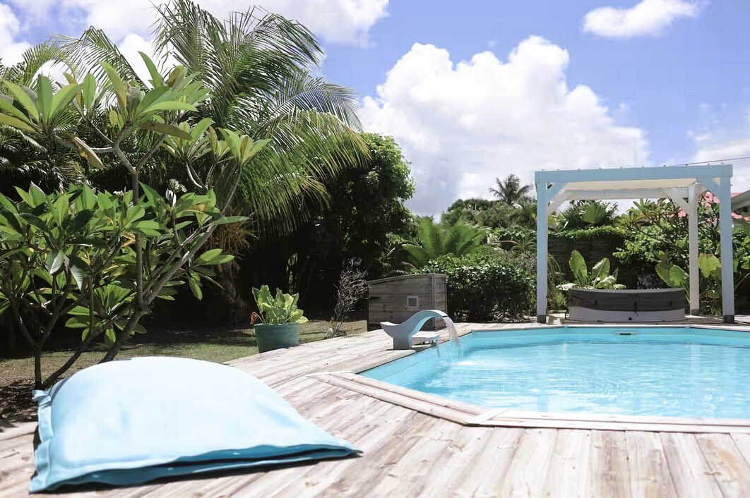 Hermosa villa individual abierta al exterior equipada para 8 personas en un jardín tropical cerrado con gran piscina de agua salada. Casa con una decoración acogedora y tropical donde todos encontrarán su lugar en la intimidad. Disfrute de sus 4 habitaciones con aire acondicionado con vistas al exterior, sus 4 baños, su cocina abierta y su zona de plancha/bar exterior. Zona tranquila a 5 minutos en coche de St François y sus playas, golf, aeródromo, kitesurf, club de buceo.