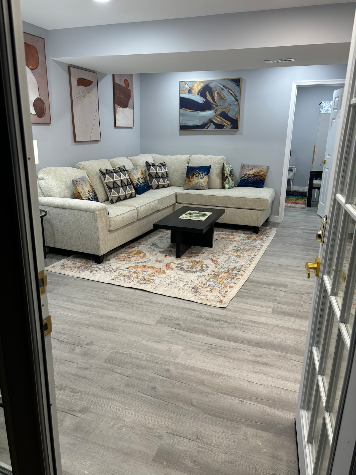 Spacious, modern, private basement space! 1 Bedroom/Bathroom, Centrally located in Northern Virginia, 35 minutes from DC. Close to local nature preserves, mall, hospital, and more! Amenities: king bed, 2 living areas, 2 Smart TVs. Kitchenette: SHAREDfull-size fridge, microwave, Keurig, air fryer, no cooktop/stove available. Private entrance, PLEASE NOTE: you will be walking through the grass to get to the basement! street parking in a quiet neighborhood. No smoking, vaping, or e-cigarettes.