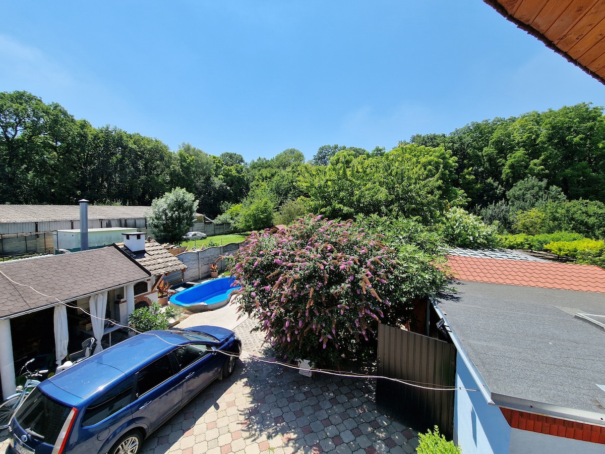 -64km from the Bratislava Airport (BTS) -There are 3 room. 2 upstairs and 1 at downstairs. -ROOM 2: This room is at the upstairs. It has 4 bed and private kitchen and bathroom with big shared balcony. -Outside there are pool and grill and large yard. There are 2 friendly dogs (Border Collie and Bichon Havanēs). -You can park inside the backyard or the street (both free) -In the town one of the biggest intrest is Thermal Corvinus. Near Town: -Bratislava (50km) -Győr(22km) -Budapest(120km)