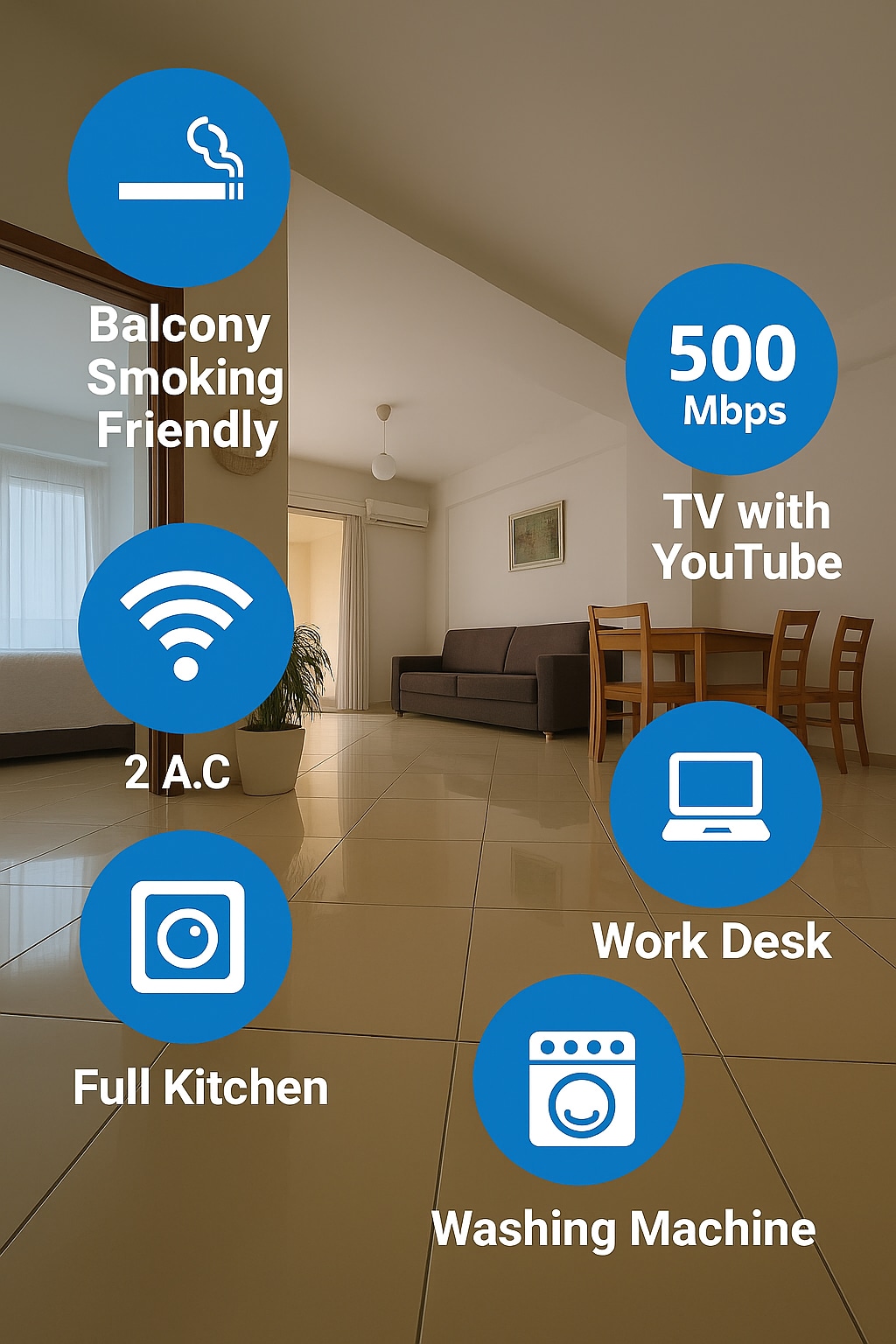 68 M2 apartment. 2 High-Quality A.C, Bedroom&Living Room. Fiber Optic Business WIFI 500 MBPS/50 Smart tv youtube&Netflix Double glazed windows soundproofing and thermal insulated windows Big Balcony (Smoking Friendly) Bedroom with A.C and queen bed Washing Machine. One sofa bed in the living room. 1 Queen bed, One sofa bed We provide professional cleaning our highest priority Supermarkets, Restaurants, Barbier, Bakery and Gym 2 minutes on foot. Coffee,Tea,Oil, Sugar&Spices.