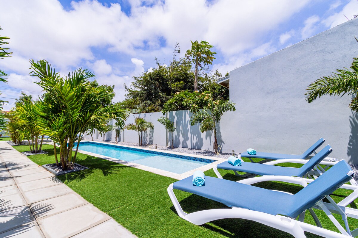 Es un complejo de apartamentos de 4 unidades con piscina y zona de estar poco profunda. Hay una puerta principal que da la bienvenida a todos los huéspedes a la propiedad. Cada apartamento tiene un porche dedicado que conduce a su entrada privada. Todas las unidades de apartamentos tienen vistas al jardín y a la piscina desde la sala de estar. Hay 3 unidades de un dormitorio y 1 apartamento tipo estudio. A solo 3-5 minutos en coche de Eagle Beach y Palm Beach o a 15-20 minutos a pie. Puedes alquilar una habitación o todo el complejo para alojar a una familia grande o un grupo.
