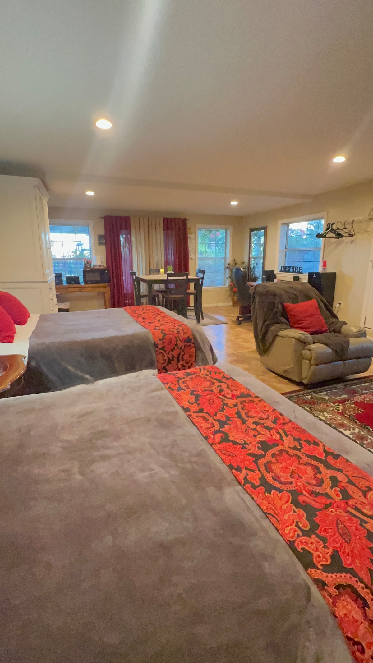 Esta es una suite de invitados que está unida a la parte trasera de la parte principal de la casa en la que vivimos y está separada por una puerta. No es una casa de huéspedes independiente. Sin embargo, es completamente privado y no hay espacios compartidos o comunes. Hay gatos que viven en nuestro lado de la casa, pero no afectarán tu área. AMIGABLE CON EL CANNABIS: ***1 PORRO GRATIS con cada registro**** Los huéspedes deben tener 21 años o más y proporcionar una identificación para reservar.