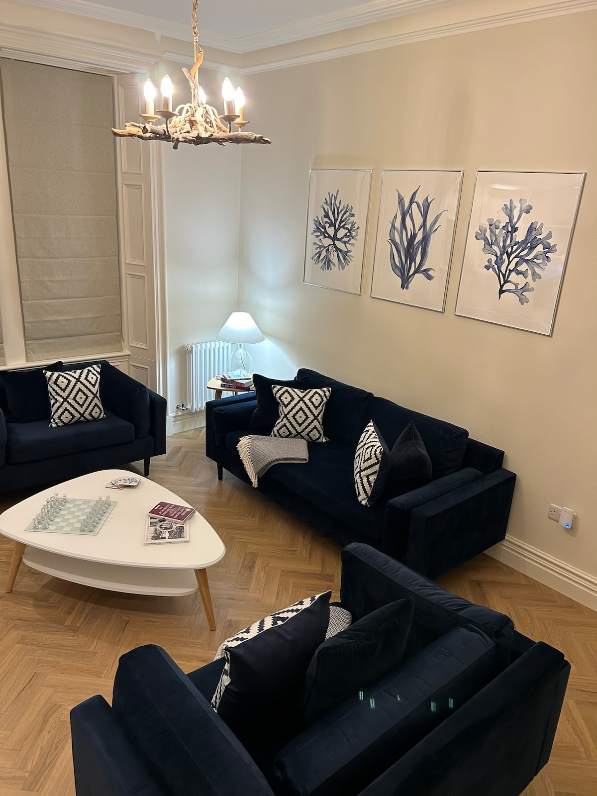 Private main door apartment at the front of a beautiful Victorian villa in the heart of North Berwick. Sea views, airy and comfortable rooms. Just 5-10 minutes walk to golf, High Street, beaches, cafes, restaurants, public pool, harbour, tennis courts. Double-aspect bedroom sleeps two with an additional double sofa-bed in the living room (only available on request) also cot for wee ones on request. On-street paid parking. 30min train to Edinburgh.