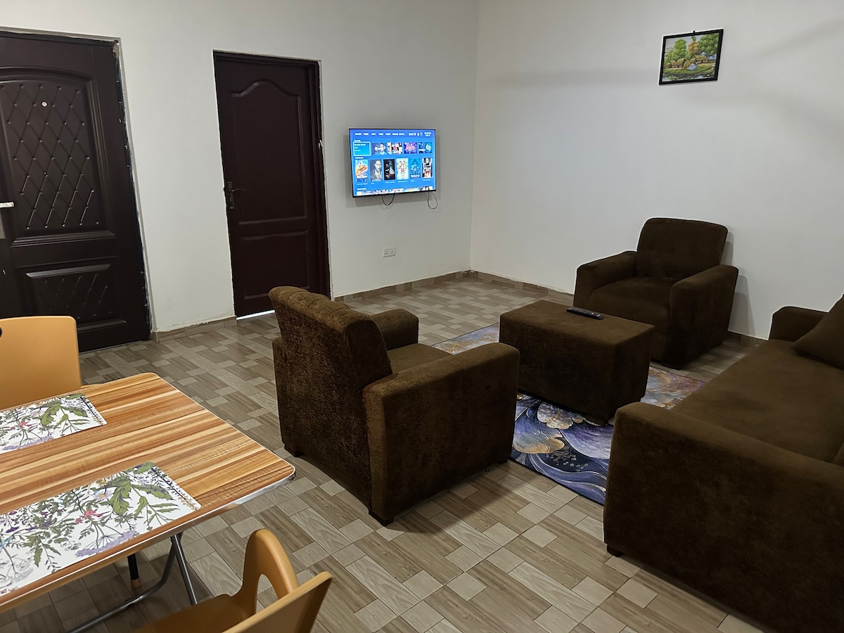 I BR apartment located at St. James Atimpoku, 3 minutes drive from Royal Senchi Hotel and Resort. Spacious and comes with a bedroom with queen-sized bed, bathroom, living room with sofas, WiFi, Smart TV both local and international Channels, kitchen with stove(not oven), fridge, cooking utensils, cutlery set. Standby generator available in times of power outage
