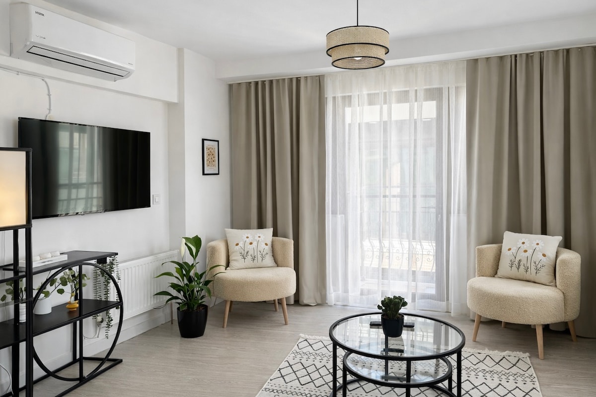 şık teraslı dubleks, şehrin en merkezi noktalarından birinde yer alır. Vapura, kafelere ve çarşıya sadece 2 dakika yürüme mesafesinde olması sayesinde şehri keşfetmek son derece kolaydır. Özel terası günün yorgunluğunu atmak için keyifli bir alan sunarken, ferah ve konforlu iç mekânlarıyla ev rahatlığını hissettirir. Kısa veya uzun konaklamalar için ideal, pratik ve rahat bir deneyim sunar. Salondaki koltuk yatak oluyor. 4 kişiye kadar rahat konaklama yapabilirsiniz.