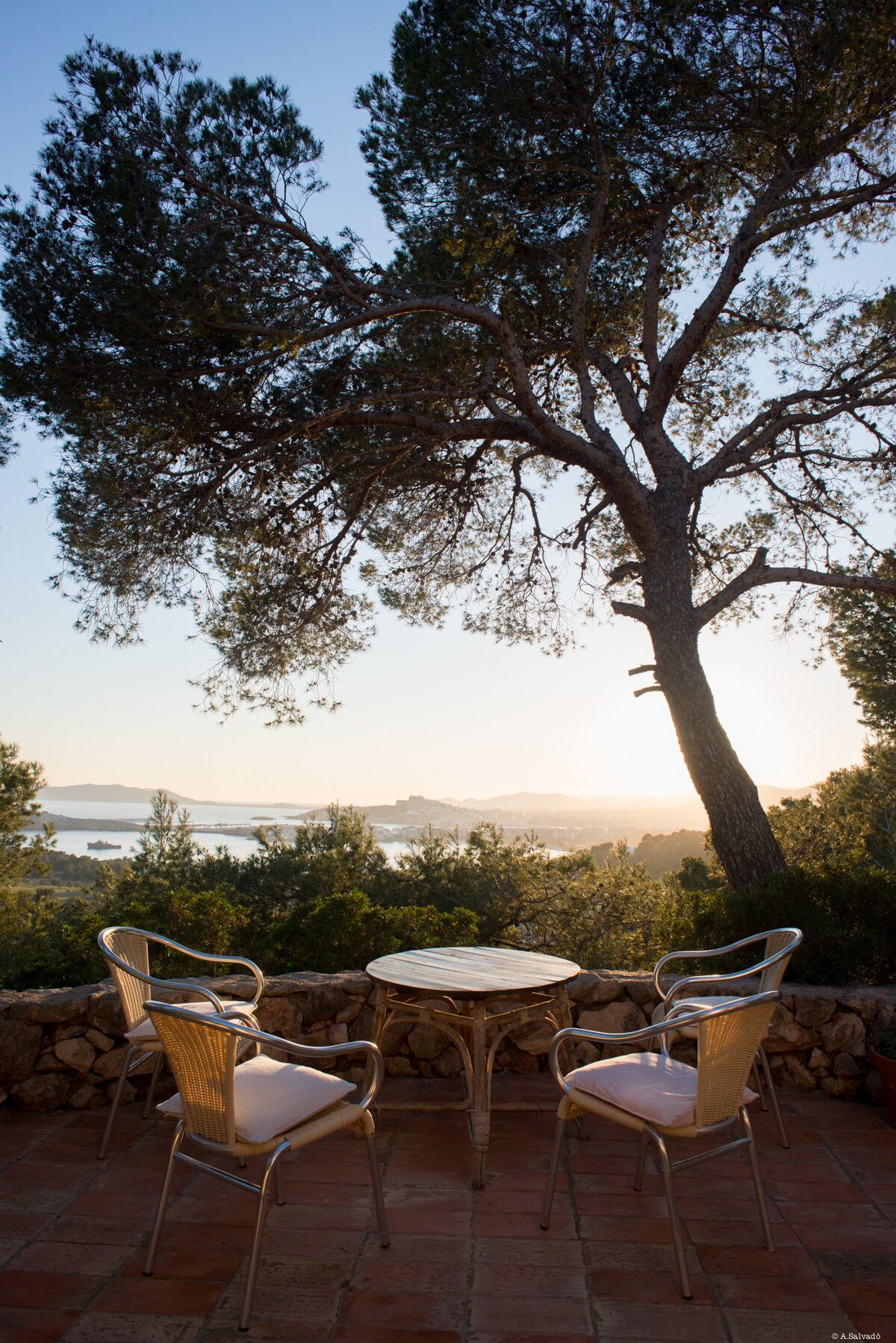 La villa esta situada en una zona muy tranquila cerca de Cala Tarida y las vistas son maravillosas. La piscina es grande 5M X 10M. La casa tiene 2 partes, es sencilla y cómoda. Casa principal; salon, comedor y cocina abierta, el dormitorio de matrimonio y el baño, están en la planta baja, arriba hay un dormitorio con una cama ovalada (140x180).La casa de huespedes esta al lado de la casa principal y tiene dos camas individuals, ducha/aseo, y terraza.