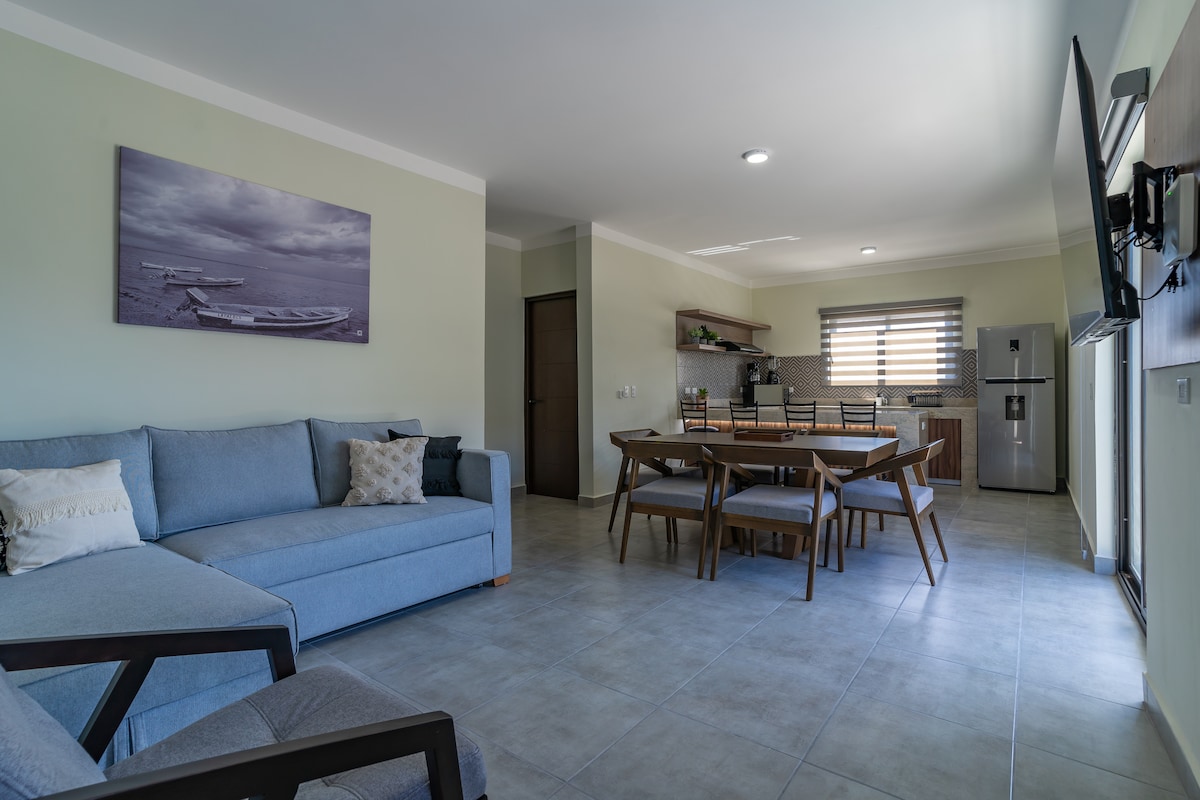 Acogedor departamento nuevo a solo 2 min del Malecón. Ideal para relajarte o explorar La Paz. Cuenta con A/C, Wi-Fi rápido, TV, cocina equipada y kit de playa. A 5 min caminando de restaurantes, museos y supermercado. Las playas a 15 min. ¡Sal y disfruta vistas al mar de Cortés! Como anfitrión local, estoy disponible para ayudarte en todo lo que necesites.