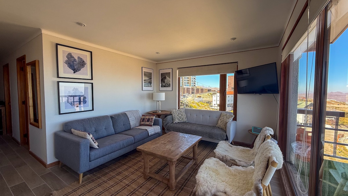 Acogedor y luminoso apartamento en el centro de Ski El Colorado, a 40 minutos de Santiago. Cuenta con salida directa a las canchas de ski. Tiene 2 dormitorios, el principal con cama matrimonial y el otro con 2 literas para 4 personas Living comedor con 2 futones como camas extras Cocina equipada BAÑOS PEQUEÑOS CON DUCHAS PEQUEÑAS Televisión con cable y Netflix WiFi gratis Calefacción El edificio cuenta con un salón común con chimenea, piscina temperada (con horario) y sala de juegos para niños