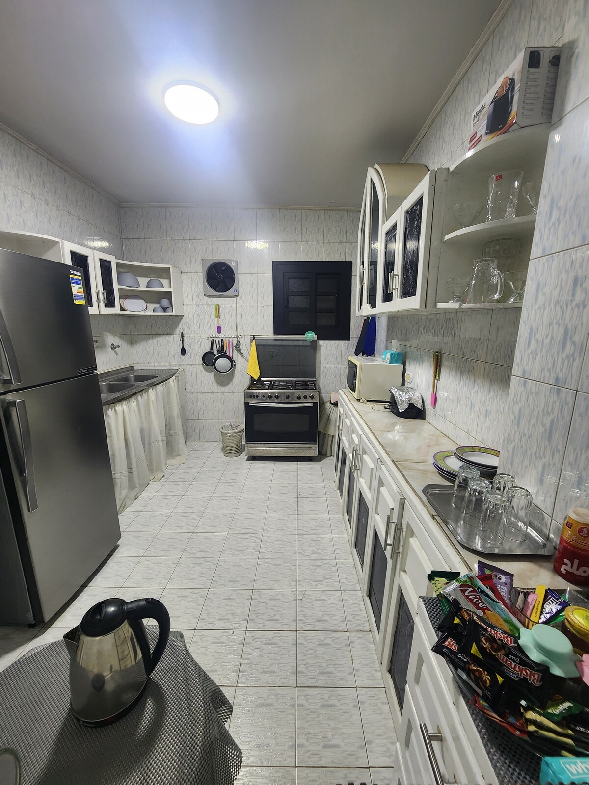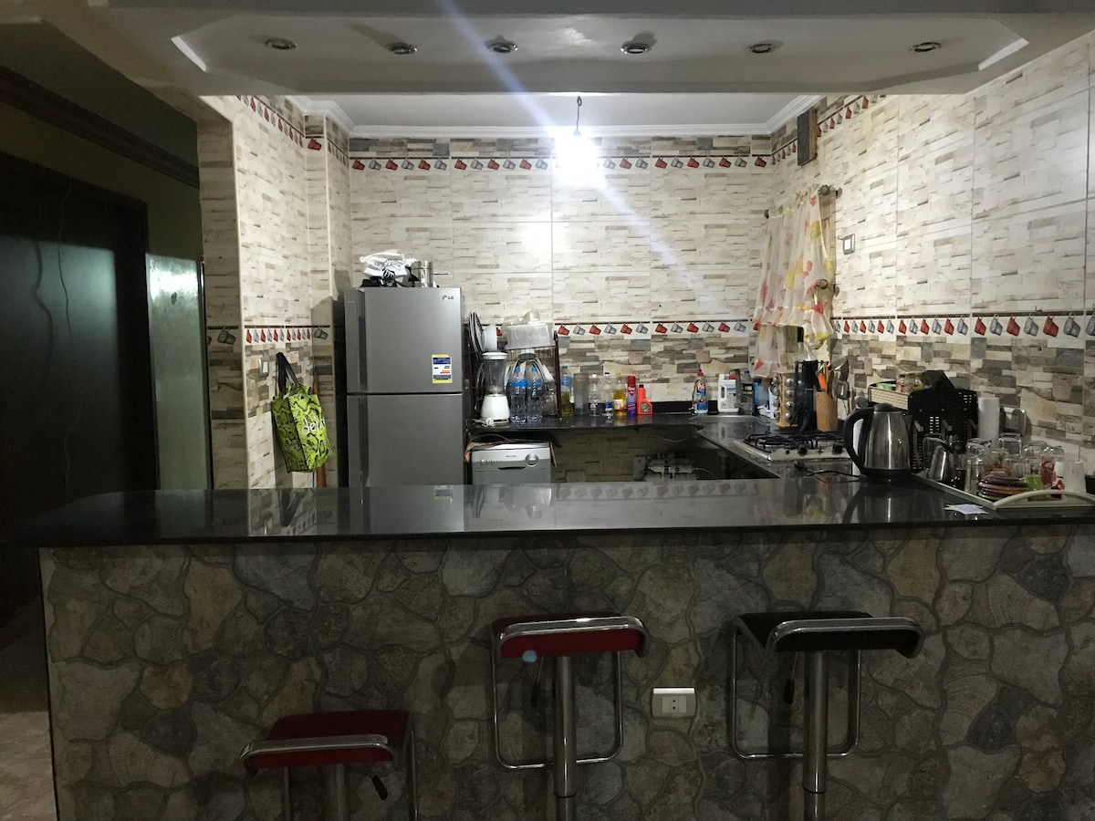 Su familia estará cerca de todo cuando se aloje en este lugar céntrico. A pocos metros a pie de la estación de tren y metro,supermercados,farmacia, etc. A 10 minutos en coche de las pirámides de Giza. 15 minutos al centro y a la plaza Tahrir. Vecinos amables. Apartamento cómodo y acogedor.