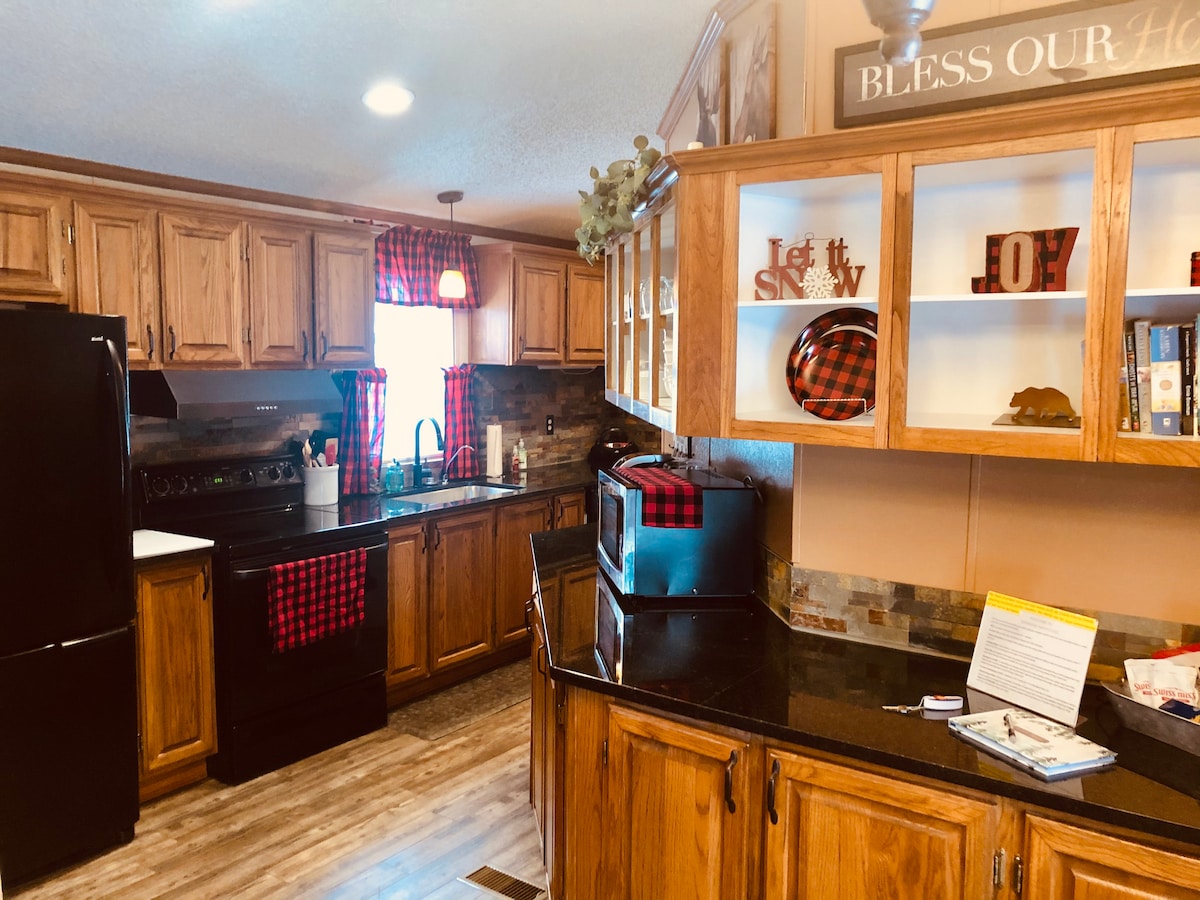 Casa de 3 dormitorios y 2 baños a la sombra de Pike's Peak. Cuenta con una rampa para sillas de ruedas, 7,5 acres de propiedad compartida con senderos boscosos para caminar y un área de patio de spa para adultos. El lugar perfecto para escapar a un entorno rural pero cerca de la ciudad. Tenemos WIFI, TV de 65", bañera de inmersión, ropa de cama nueva, cocina/despensa surtida, estudio de arte de temporada, asientos al aire libre, fogata y estacionamiento en el lugar. El precio base es para 4 huéspedes (capacidad para 8 personas). Para grupos más grandes, también tenemos un sitio de casas rodantes con conexiones.