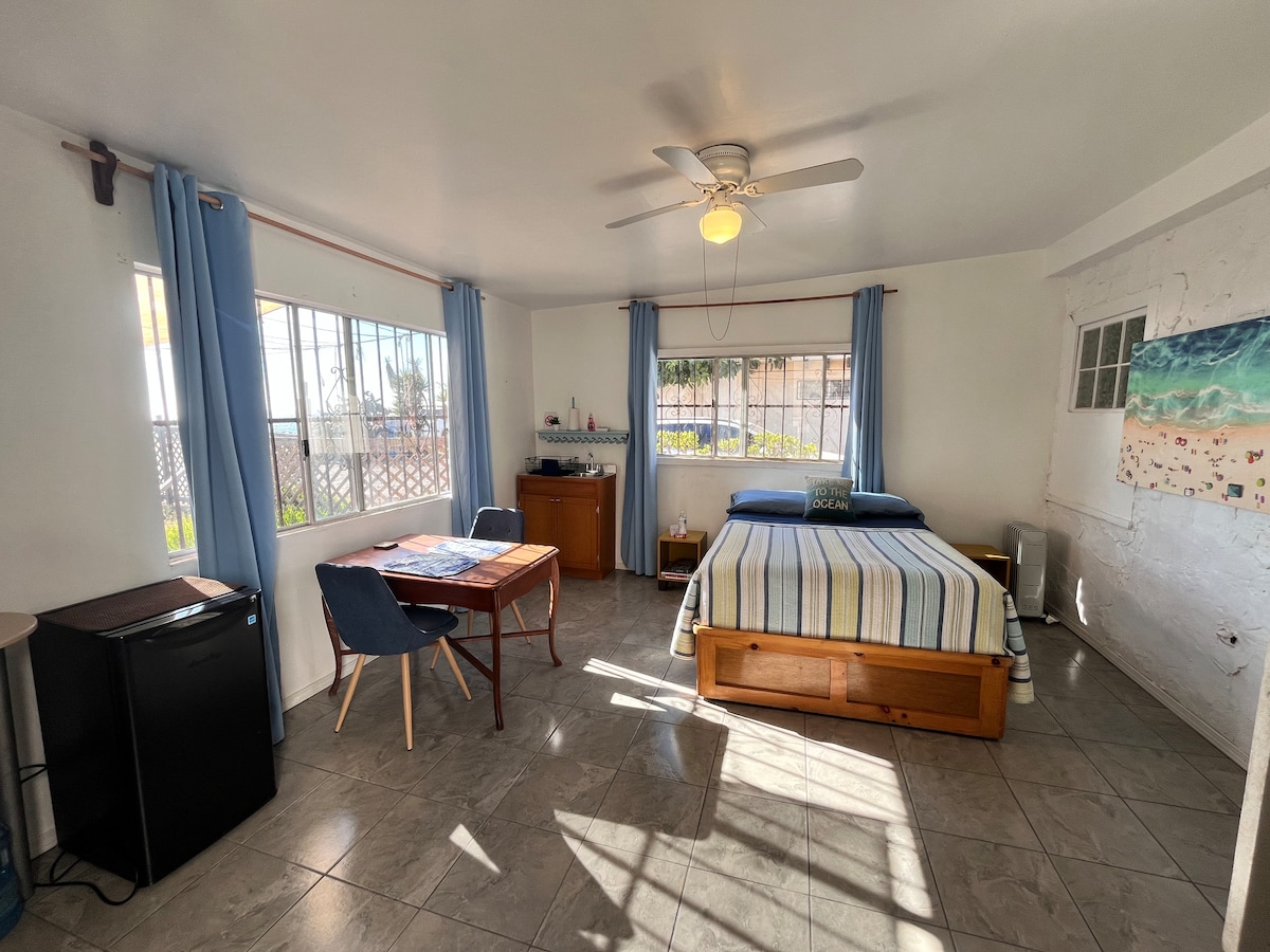 Mini suite con vista al mar y patio con área de fogata y asador Disfrutarás de la brisa y el sonido de las olas. Sencilla y acogedora dentro de una privada con solo 3 casitas. Adaptaba de forma independiente en la parte de abajo de una casa que también rentamos por Airbnb, cada quien tiene su espacio independiente. A unos pasos tenemos un hermoso mirador frente al mar (no hay acceso al mar) y un famoso restaurante, cervecerías y cafes, todo caminando. Con estacionamiento en área común enrejada.