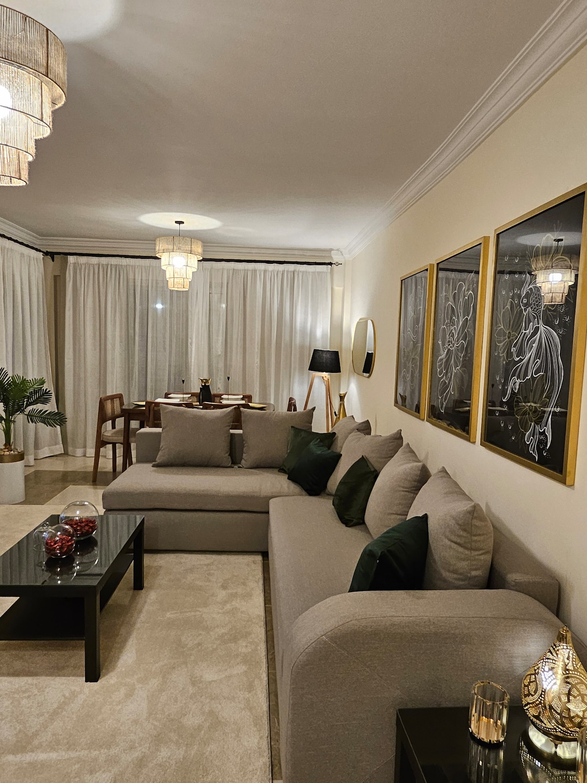 Este lugar único tiene un estilo propio. Un amplio apartamento de 1 dormitorio con una cama extraíble para invitados y una cocina completa, en la planta baja con un lujoso patio trasero y entrada privada en un recinto seguro. Cerca de grandes centros comerciales y parques empresariales en Central Zayed. El complejo también cuenta con elementos esenciales como seguridad 24/7, acceso cerrado y muchas tiendas de conveniencia cercanas que hacen entregas. A solo 25 minutos de las pirámides, a 15 de Smart Village y a 20 del Gran Museo Egipcio.