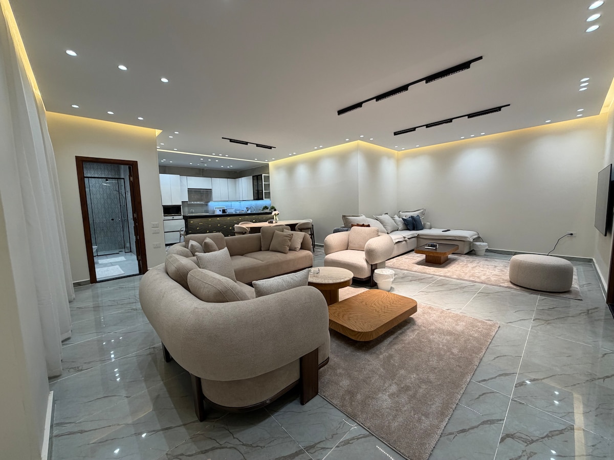 Bring the whole family to this spacious 160 sqm fully furnished apartment in Sheikh Zayed. Located on the ground floor, it features a 150 sqm private garden with a tree fence for privacy. It includes 3 bedrooms, 2 bathrooms, a kitchen, and a living room. The apartment is equipped with modern appliances, central AC, heating, security cameras, and elegant furniture. Situated in a quiet, secure compound with 24/7 security, it is close to entertainment and international restaurants.