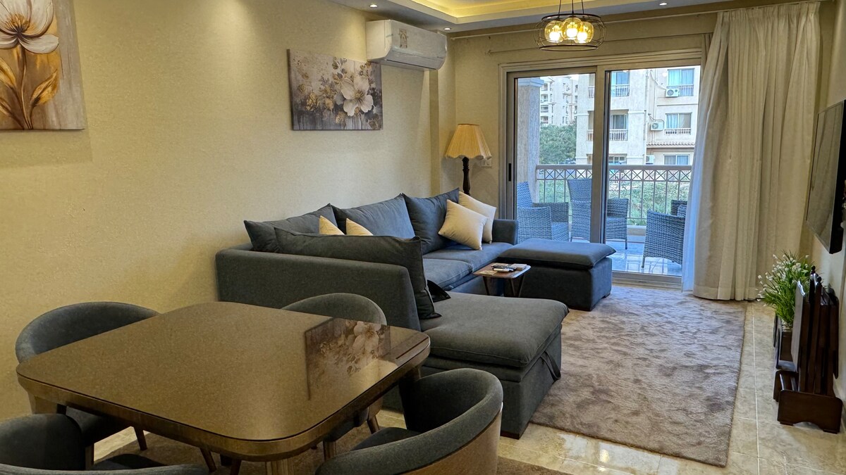 An ENTIRE APARTMENT with a back garden situated in a beautiful and green area in a peacefully integrated community fulfilling all residents' needs. Rooms are newly furnished, air conditioned, smart T.V. and all amenities you might need, super CLEAN and QUIET. The apartment is 25 minutes from Cairo intInternational Airport. coffee shops, restaurants, supermarkets, and pharmacies are all nearby. Hotel standard quality with home like comfort offered with a REASONABLE PRICED.