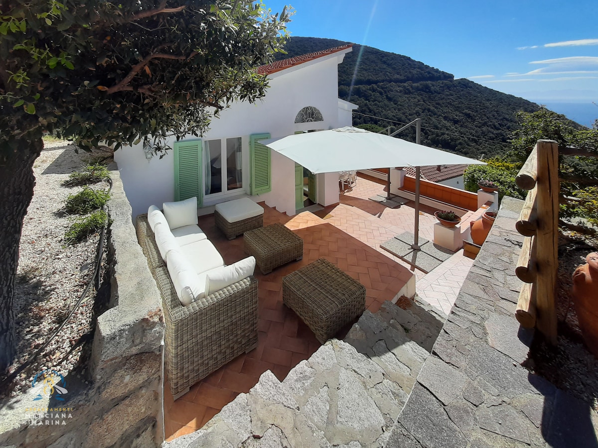 "LA MARINA",romántica casa de campo de lujo a solo 80 metros del mar cristalino de Chiessi, un pintoresco pueblo de la costa oeste llamado"Costa del Sol"debido al clima cálido durante todo el año. Un lugar para los viajeros despreocupados que quieren unas vacaciones fuera de los caminos más transitados y lejos de lugares turísticos abarrotados. Maravillosas rocas blancas y playa de guijarros a poca distancia a pie,las famosas playas de arena blanca de Fetovaia y Cavoli a solo 5 minutos en coche. Jardín privado con barbacoa y terraza con vistas al mar. Wifi.