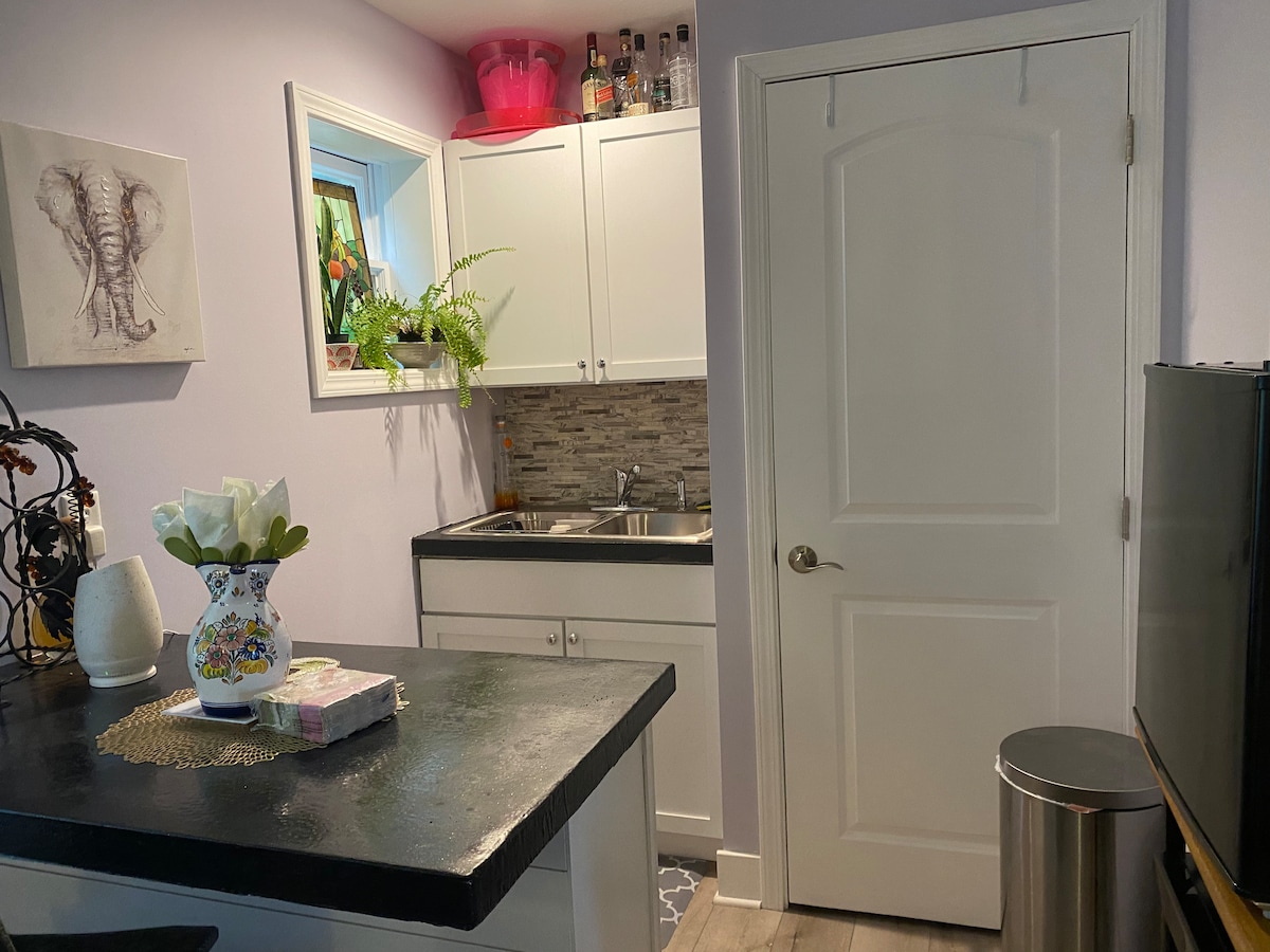 The Serenity Suite is one of two listings to accommodate guests. This suite is a 230 sq ft. tiny house studio apartment created in 2022. A kitchen island with 2 barstools is in the center of the space. This can be used as a sit down eating spot or a dedicated workspace. The 3/4 bath boasts up to date accessories and soft, thirsty towels. Please check out our Whispering Pines listing for a more spacious area. It will accommodate 1-5 guests at a very competitive price.