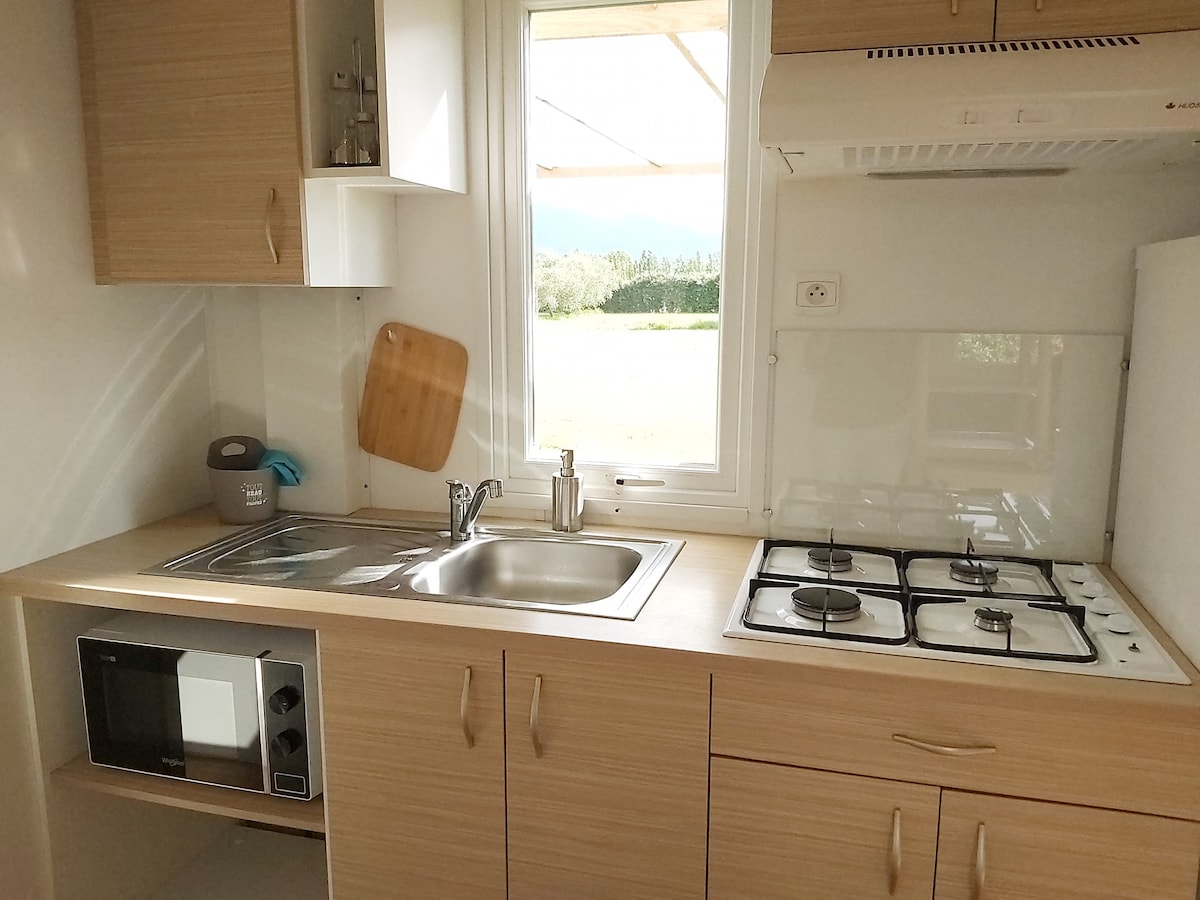 MOBIL-HOME de 6 plazas y 40 m² con aire acondicionado reversible, gran terraza exterior vallada con 1 puerta de seguridad, muebles de jardín y 2 tumbonas. Amplio salón con TV orientable, 1 sofá cama de 2 plazas, 2 habitaciones grandes, 1 de ellas principal, ropa de cama de alta gama con un gran vestidor y TV Cocina equipada, vajilla, horno, microondas, placa eléctrica, nevera con congelador, tostadora, hervidor, cafetera de filtro y cápsulas TASSIMO, lavavajillas, lavadora y tendedero.