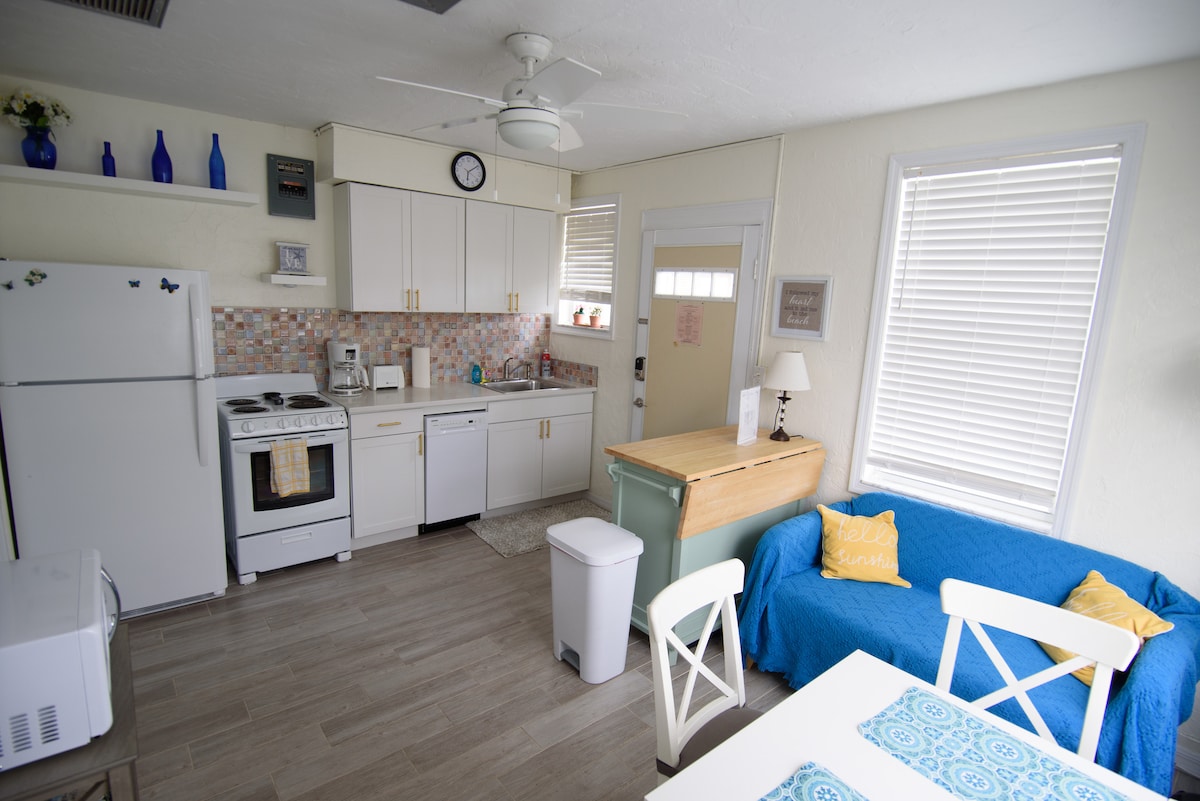 La acogedora y encantadora unidad "playera" RECIENTEMENTE RENOVADA está diseñada específicamente para sentirse mucho más abierta y espaciosa de lo que normalmente se pensaría como un estudio. El techo de madera personalizado le da una sensación muy pintoresca en el interior. Eficiencia Cocina con nevera azul retro completa, microondas, horno tostador grande y sartenes eléctricas para sus necesidades de cocina. Nueva cama Queen con luces, sábanas suaves y almohadas mullidas. Smart TV con cable y wifi. Incluye sillas de playa, sombrilla, toallas de playa y una hielera.