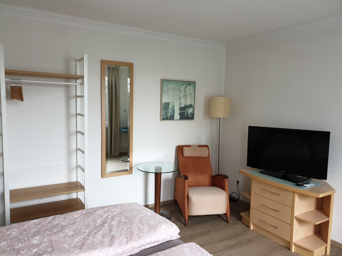 El acogedor apartamento de 2 habitaciones se encuentra en el primer piso con balcón al jardín. El dormitorio está amueblado con una cama de 140x200, armario, TV, etc. En el gran salón hay un sofá cama para 2 personas., TV, piano. Mesa de comedor y una pequeña cocina. Desayuno para preparar por uno mismo en estancias cortas. Rodeada de árboles centenarios en la tranquilidad, la hermosa ciudad de Ratingen se encuentra a 10-15 minutos a pie. Feria de Düsseldorf 15 min (coche), 50-65 min (autobús/tren) Aeropuerto a 15 min.