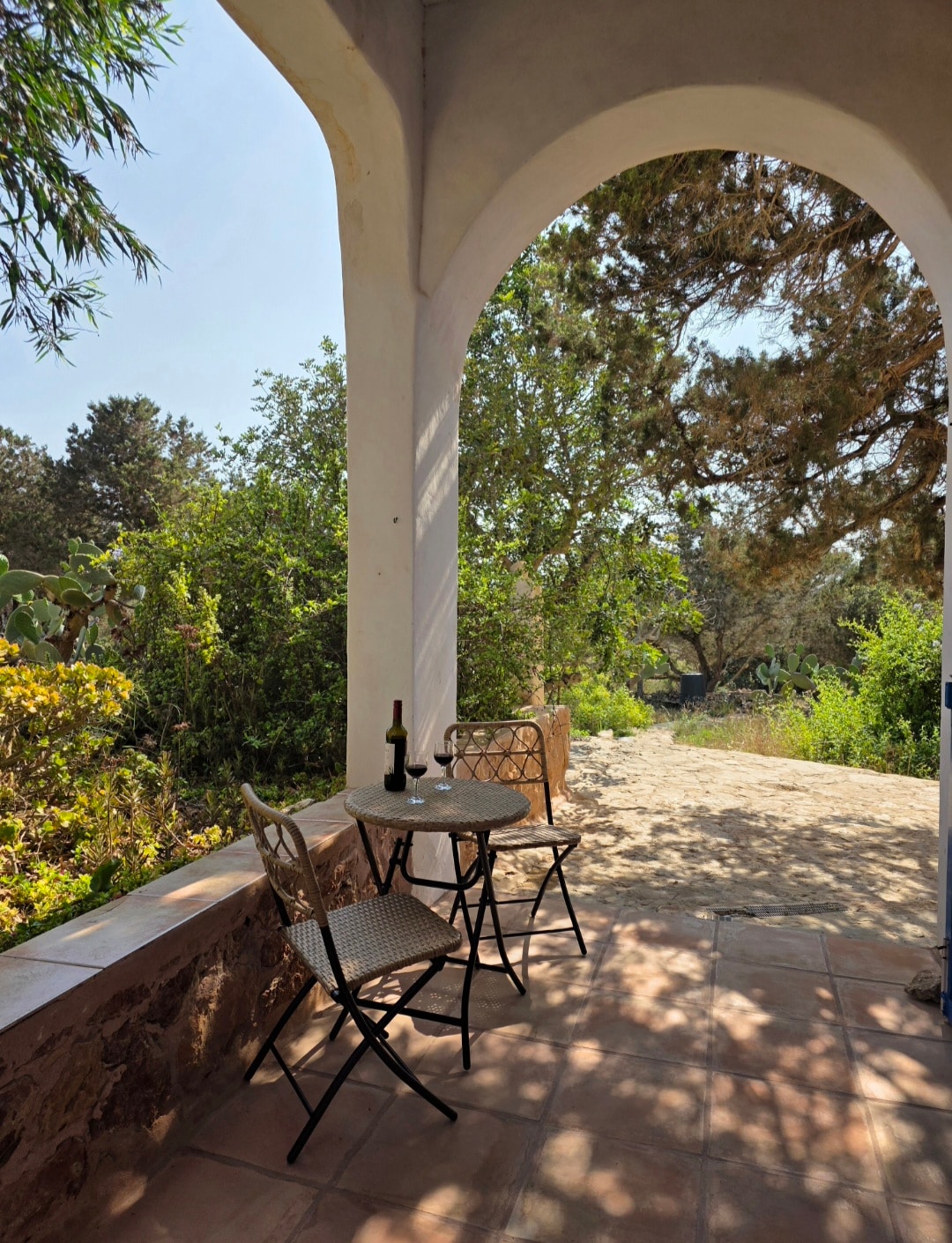 Casa/apartamento, con un amplio y bonito jardín con terraza. Cerca de las mejores playas de Formentera y al lado de una de las rutas más bonitas de la isla, La savina - Ses Illetes. 2 habitaciones (1 con cama de grande y 1 con dos camas). 2 cuartos de baño Cocina y salón/comedor. Amplia terraza y jardín. Accesible sin escalera. Posibilidad de cuna para bebe. Habitaciones y salón con aire acondicionado, ventiladores de techo y wifi. Parking gratuito. Supermercados a 1 min. Parada bus a 1min.