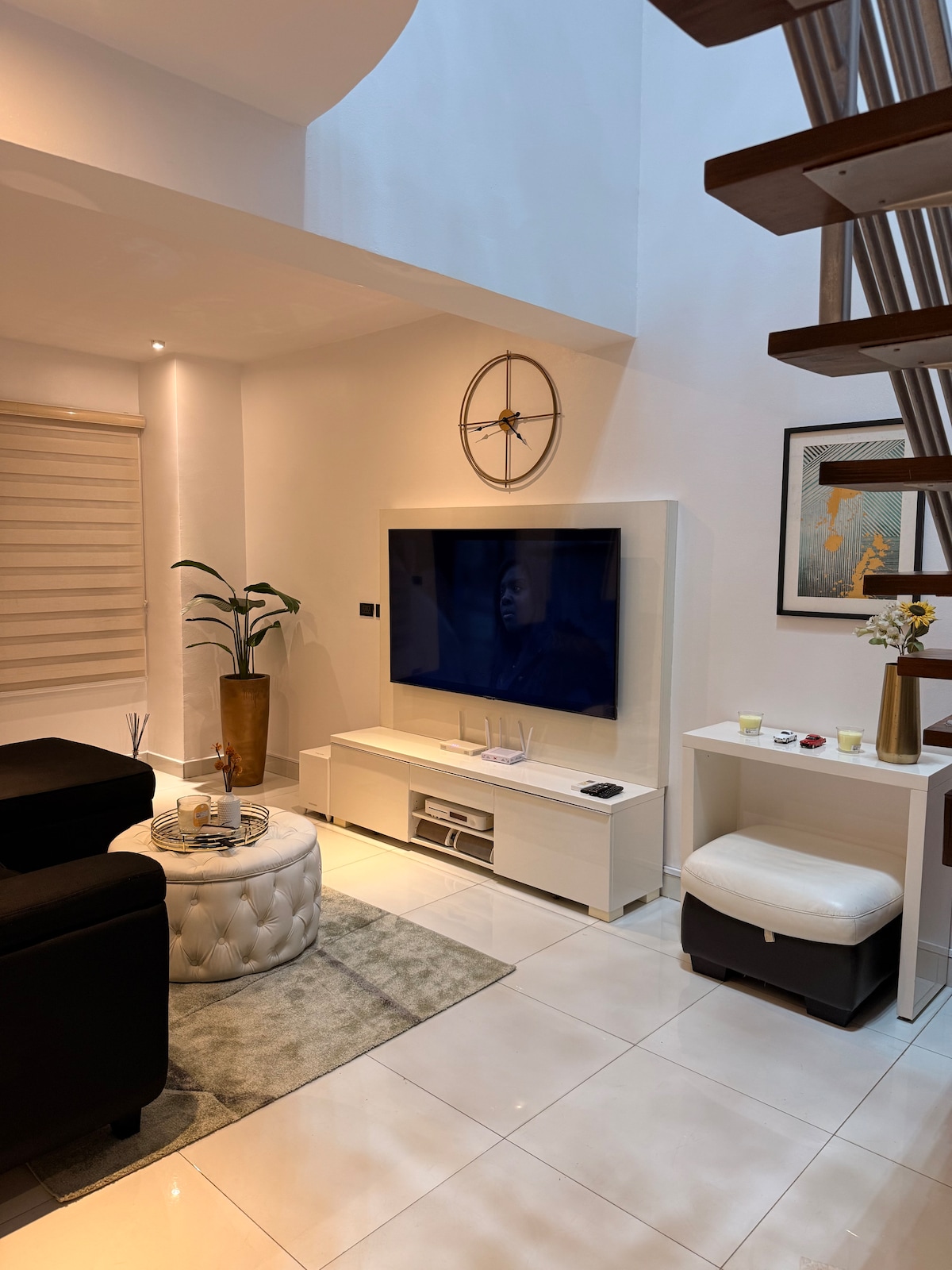 Stylish 2-bedroom loft apartment in Lekki Phase 1, designed for comfort and convenience. Ideal for both business and leisure stays, featuring a dedicated workspace and ultra-fast dual fibre optic internet for reliable 24/7 connectivity. Enjoy seamless self check-in, free parking, and a peaceful, secure estate with 24-hour electricity and security. Smart TVs with DSTV (including football channels) and Netflix are available in both the living room and master bedroom.