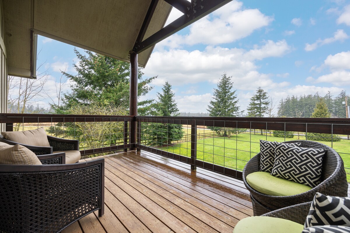 Enjoy a view of Mt Baker in the quiet, beautiful countryside. There are 3 bdrms, kitchen, dining & living areas, covered porch with gas grill , fire pit, & private hot tub. Country sounds abound —coyotes, cows and roosters (right next door). The pool & another hot tub are about 150' away & ALSO AVAILABLE TO OTHER GUESTS ON THE PROPERTY. Reserve the times you want. $25 per day per pet fee. NO ADULT PARTIES AND NO MORE THAN 7 GUESTS at any time during the stay without a charge of $15 per guest.