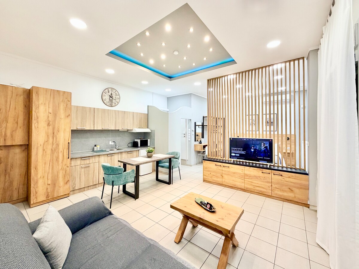 Estudio elegante y elegante en pleno corazón de la vida social de Salónica. Ideal para parejas, solteros o viajeros de negocios Alta velocidad, Internet, colchón de alta calidad, una máquina Nespresso y Netflix. Lavadora/secadora, plancha y tabla de planchar. A solo 2 minutos del paseo marítimo y del puerto, y a 5 minutos de la plaza Aristotelous.