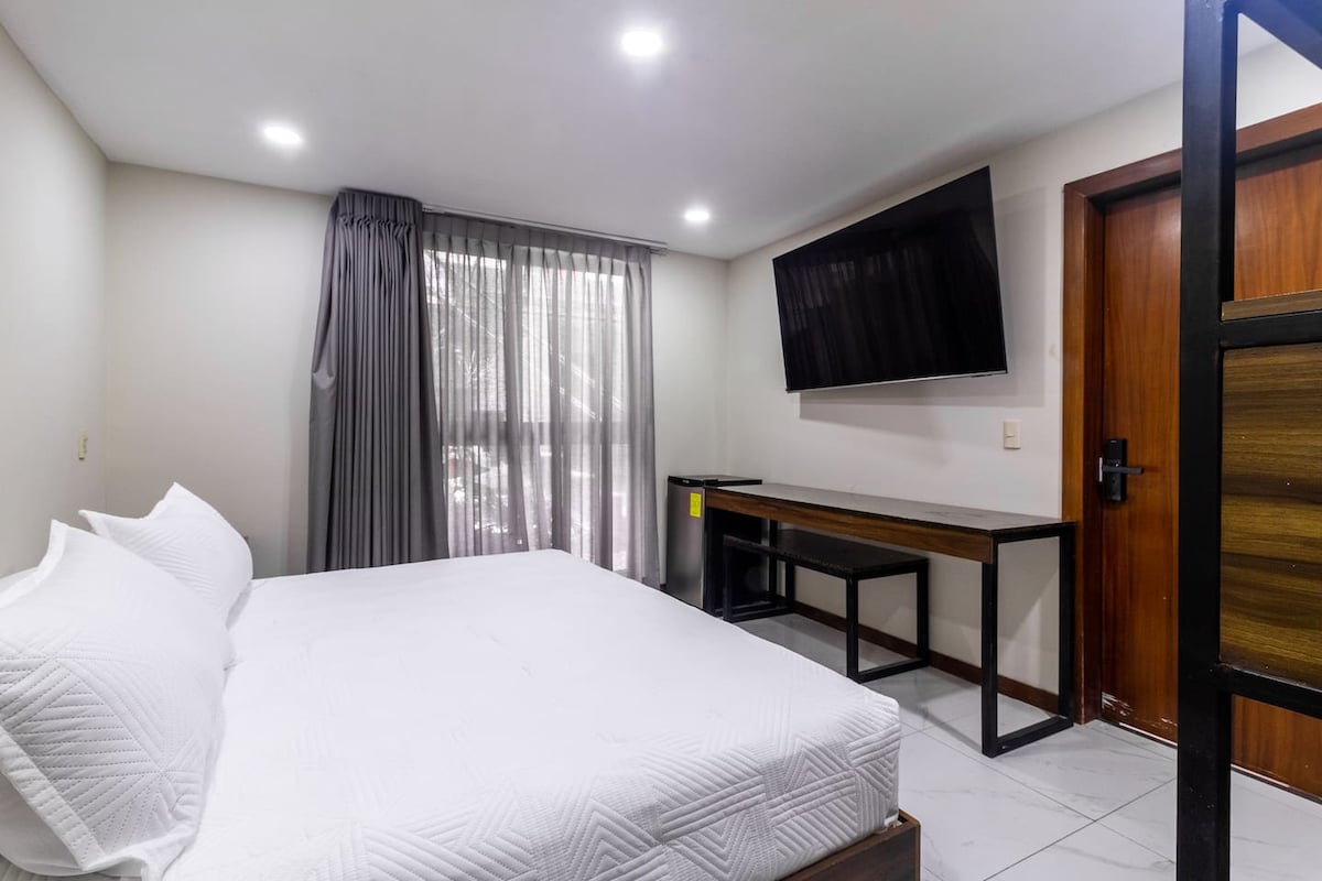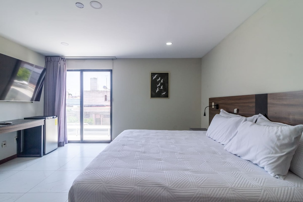 Amplia habitación Deluxe con balcón privado y cama king size. ✔ Cama king size para un descanso inigualable ✔ Balcón privado, perfecta para disfrutar del aire libre ✔ TV de 65” con acceso a streaming ✔ Internet de alta velocidad ✔ Frigobar, aire acondicionado y secadora de cabello ✔ Baño privado con acabados modernos ✔ Escritorio y silla, ideal para home office ✔ Acceso con código remoto, sin necesidad de llaves ¡Pregunten cualquier duda que tengan!