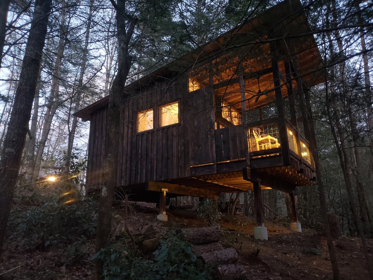 Una cabaña de campamento elevada que se encuentra en el borde de un acantilado con vistas impresionantes del hermoso Byrd Creek. La plataforma tiene aproximadamente 450 pies cuadrados con electricidad, mininevera y altavoz Bluetooth. No cuenta con cocina ni baño. Hay una gran zona común con baños y cocina al aire libre a menos de un minuto a pie. La cabaña no tiene aire acondicionado, pero varios ventiladores de techo grandes y el aislamiento mantienen la cabaña cómoda en verano.