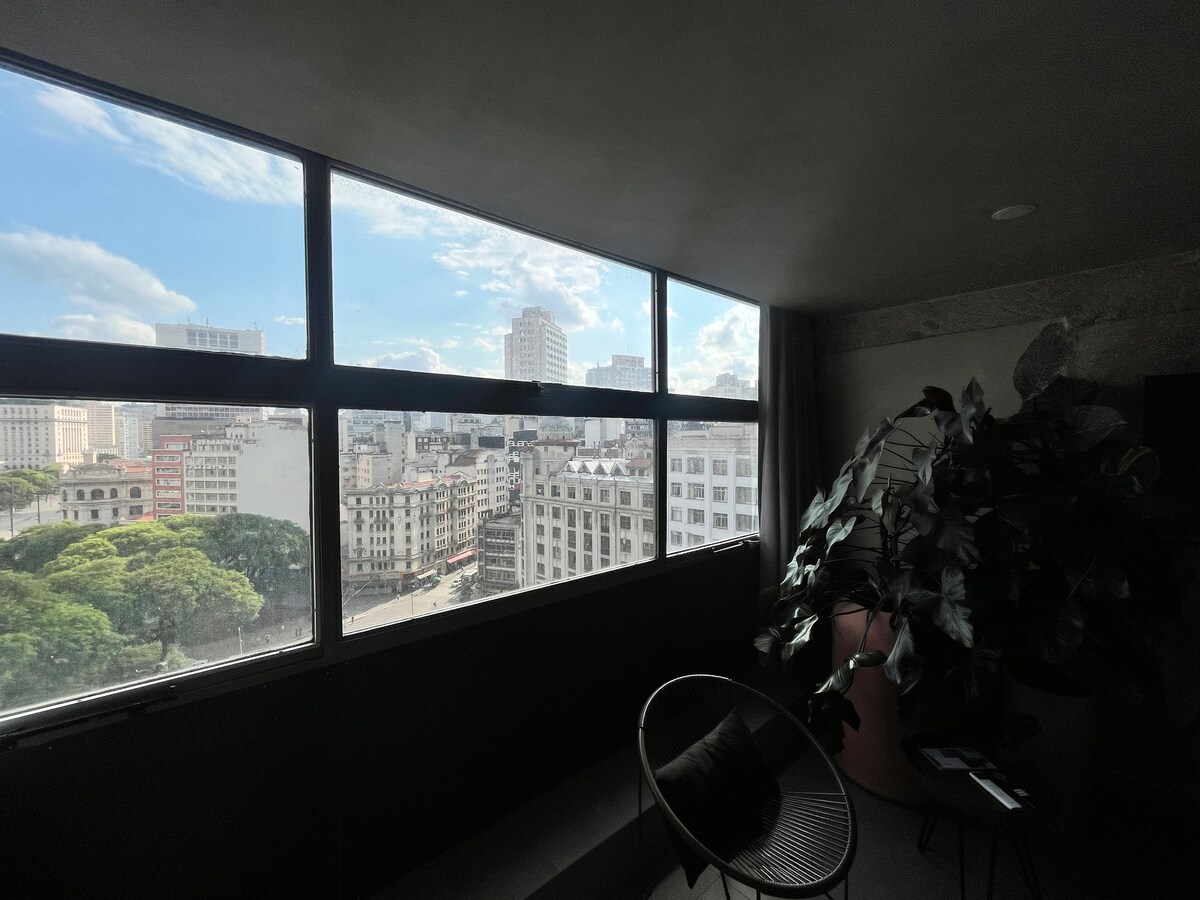Estudio industrial de 35 m² en la planta 39, con vistas panorámicas del valle de Anhangabaú. Ambiente moderno con hormigón, ladrillo visto, madera, metal y un mural exclusivo de Caio Fonseca, que aporta identidad y autenticidad al entorno. Cerca de bares, restaurantes, la ruta gastronómica de la República, tiendas populares y teatros/museos/centros culturales. Ideal para parejas, fotógrafos y nómadas digitales que buscan comodidad y estilo en el centro de São Paulo.