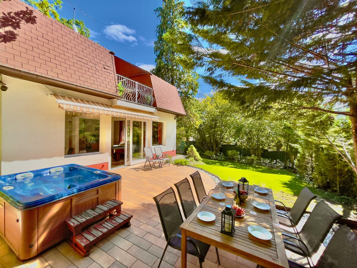 VILLA PRIVADA de 250 nm con sauna interior JAKUZZI + infra SAUNA y PISCINA climatizada al aire libre para familias, parejas y grupos de amigos. Nuestra casa está situada en las afueras de Budapest, lo suficientemente lejos del ruido diario y las multitudes, pero lo suficientemente cerca como para admirar las impresionantes vistas de Budapest. Definitivamente te relajarás aquí después de un agotador día de turismo :) Ven y disfruta :)