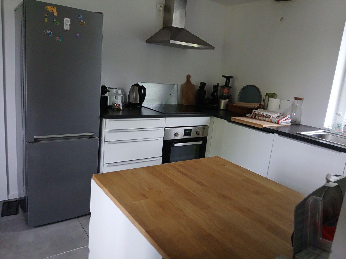 Disfrute de un alojamiento elegante y céntrico. Casa de pueblo: 1 salón con chimenea (leña incluida), cocina totalmente equipada (lavavajillas, microondas, hervidor de agua, tostadora, etc.), patio soleado, 1 dormitorio con cama de 160 cm x 200 cm, 1 dormitorio con 2 camas de 90 cm x 200 cm (cuna/silla de bebé posible), baño (bañera), aseo separado, wifi, zona de escritorio y zona infantil. Este alojamiento acaba de ser totalmente rehabilitado. Muy tranquilo. Muchas actividades en los alrededores (equitación, senderismo, ciclismo, varias tiendas).