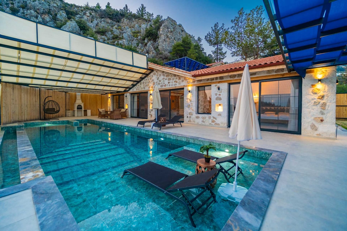 Se encuentra a 2 km del mar, la playa, a 1 km del mercado, a 10 km del centro de Fethiye y a 25 km de Ölüdeniz. Se encuentra en el área de Fethiye Çiftlik. Es una villa construida en 2023, totalmente amueblada con muebles modernos, con piscina y jardín propios, y también un jacuzzi. Tiene un entorno tranquilo para la familia y tenemos una silla alta y una cama en el parque para tus bebés.