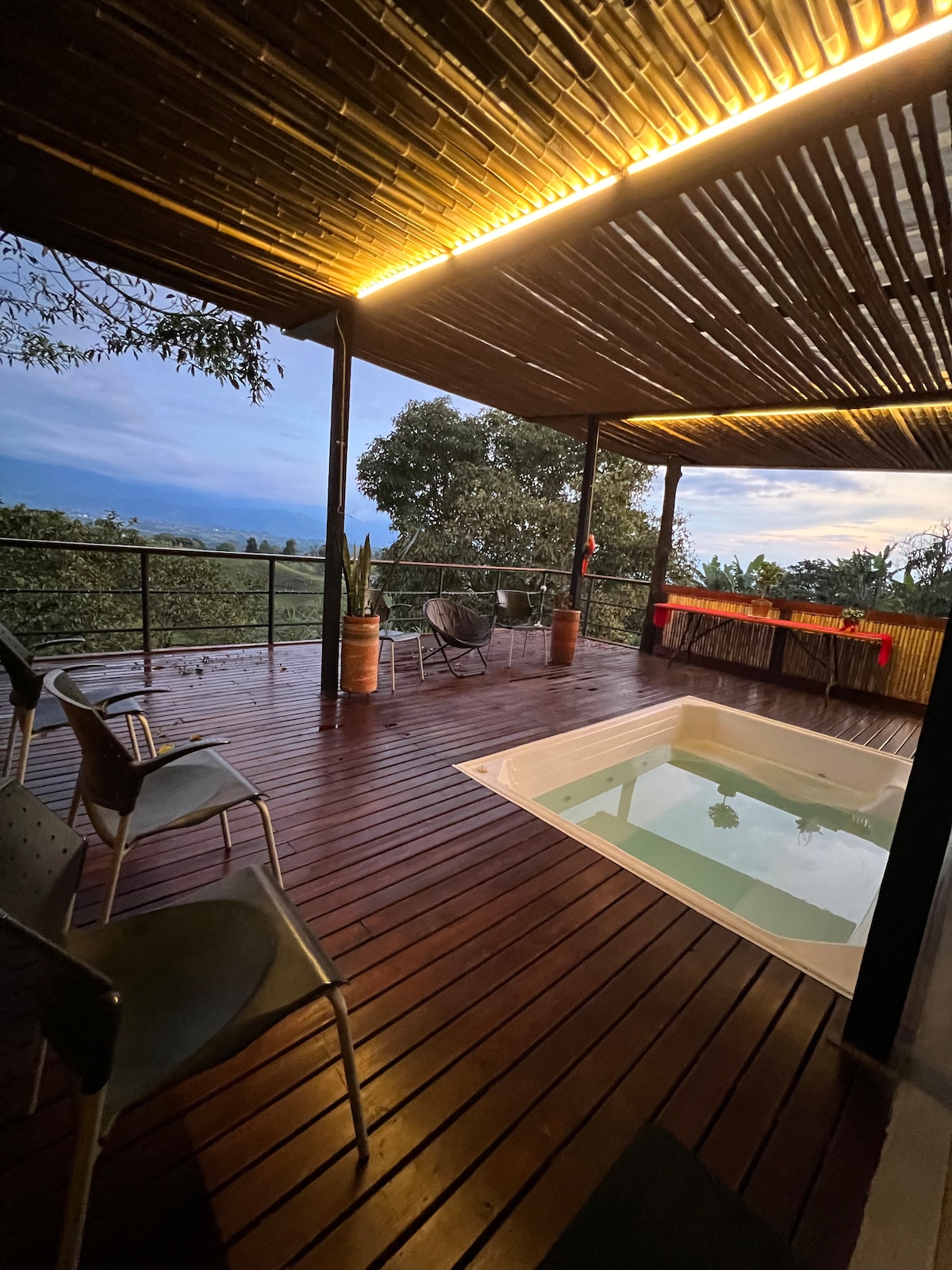 Escápate a una casa campestre rodeada de naturaleza y silencio, a solo 5 minutos del parque principal de Filandia. Disfruta noches de fogata, paisajes cafeteros y espacios amplios para compartir con familia o amigos. Un refugio de diseño en medio del paisaje cafetero colombiano. Vive una experiencia de tranquilidad y naturaleza en estado puro. Disfruta de una vista panorámica sobre el bosque y los valles de Quindío. Amaneceres inolvidables, cielos estrellados y atardeceres mágicos