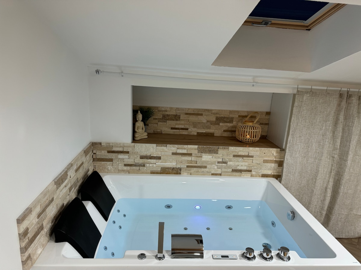 maisonnette 2 pièces de 40m2 idéal pour 2 personnes mais pouvant accueillir un bébé. Séjour salle à manger TV connectée avec netflix disney + prime vidéo et apple tv+ fourni en bas.WIFI, cuisine équipée salle de bain. A l'étage une chambre double avec jacuzzi, éclairage personnalisable + écran 55" QLED avec Apple TV pour profiter tout en se relaxant !! Parking 1 voiture ou motos (WELCOME BIKERS🔥) ⚠️ PRESTATIONS OPTIONNELLES SUSPENDUES POUR LE MOMENT⚠️