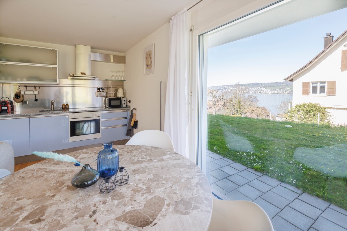 En este acogedor alojamiento pasarás un buen rato. Vista al lago y a todo el campo. La conexión con el transporte público es muy buena, por lo que se puede llegar rápidamente a las ciudades de Zúrich, Zug y Lucerna. El apartamento está situado en un bonito barrio y el lago está a tiro de piedra. Allí se encuentran el Badi, una cancha de voleibol de playa y instalaciones de entrenamiento. El apartamento está decorado con materiales de alta calidad.