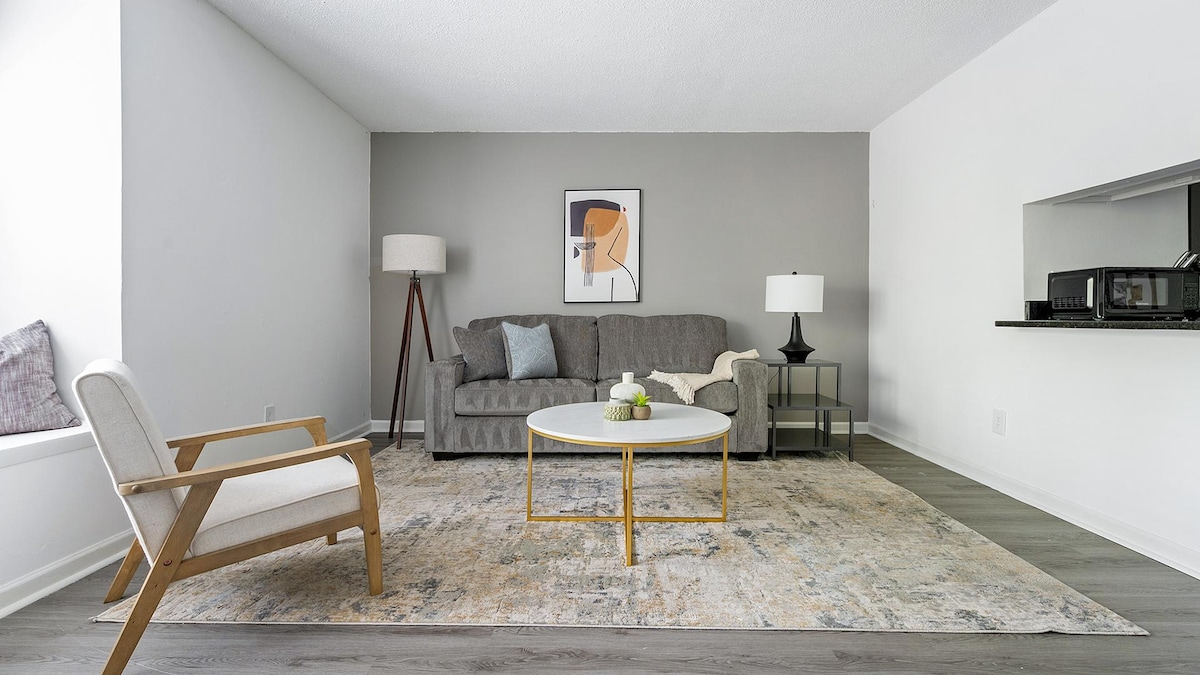 Alójate con estilo en el corazón del centro de Winston-Salem, a pocos pasos de los restaurantes de la calle 4, el estadio Truist y el centro de convenciones Benton. Esta moderna suite de 1 dormitorio cuenta con una cama tamaño king, cocina completa, wifi rápido y lavandería en la unidad, además de acceso a una piscina, gimnasio y estacionamiento gratuito. *Estudio con media pared y cortinas para mayor privacidad *Cama extraíble tamaño queen en la sala de estar *2 televisores inteligentes (55" y 43") *Wifi ultrarrápido * Cuarto de lavandería en la unidad -Piscina y gimnasio * Requisito de edad para mayores de 25años * Se requiere identificación y selección *Comunidad 100% libre de humo