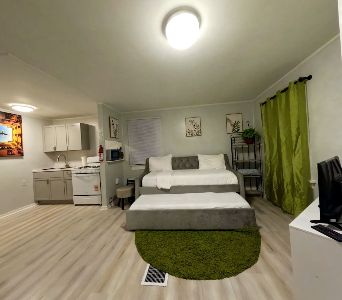 Acogedor apartamento de 2 dormitorios en Decatur Indiana. Con 2 camas tamaño queen y un cómodo sofá cama extraíble de tamaño completo. Cada dormitorio tiene un televisor y almohadas y mantas adicionales. La cocina proporciona todos los elementos esenciales para que puedas preparar tus comidas favoritas, cafetera Keurig y cafetera de goteo. Se proporcionan todas las toallas de baño y jabón, con lavadora y secadora disponibles para tu comodidad. Televisor inteligente de 55 pulgadas con Netflix y otras aplicaciones para tu entretenimiento, junto con juegos/naipes para disfrutar.
